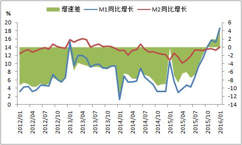 2016年1月末,M1和M2分別同比增長18.6%、14%,增速較上月同期提高3.4和0.7個百分點。其中,M2增速攀升,主要是信貸投放帶動派生存款大幅增加。M1增速攀升,主要是1月份央行通過開展逆回購、MLF、SLF等多元化貨幣政策工具向市場凈投放逾萬億元基礎(chǔ)貨幣。