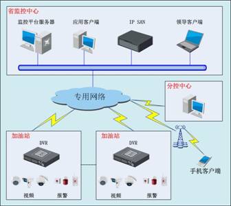 系統(tǒng)整體上劃分為叁個(gè)部分:包括省級(jí)監(jiān)控中心,地市級(jí)分控中心和加油站部分。在前端每個(gè)加油站采用硬盤(pán)錄像機(jī)作為系統(tǒng)接入的主要設(shè)備,在加油站省級(jí)管理單位設(shè)置集中監(jiān)控、管理平臺(tái)。在其他管理單位設(shè)分控中心或客戶(hù)端。